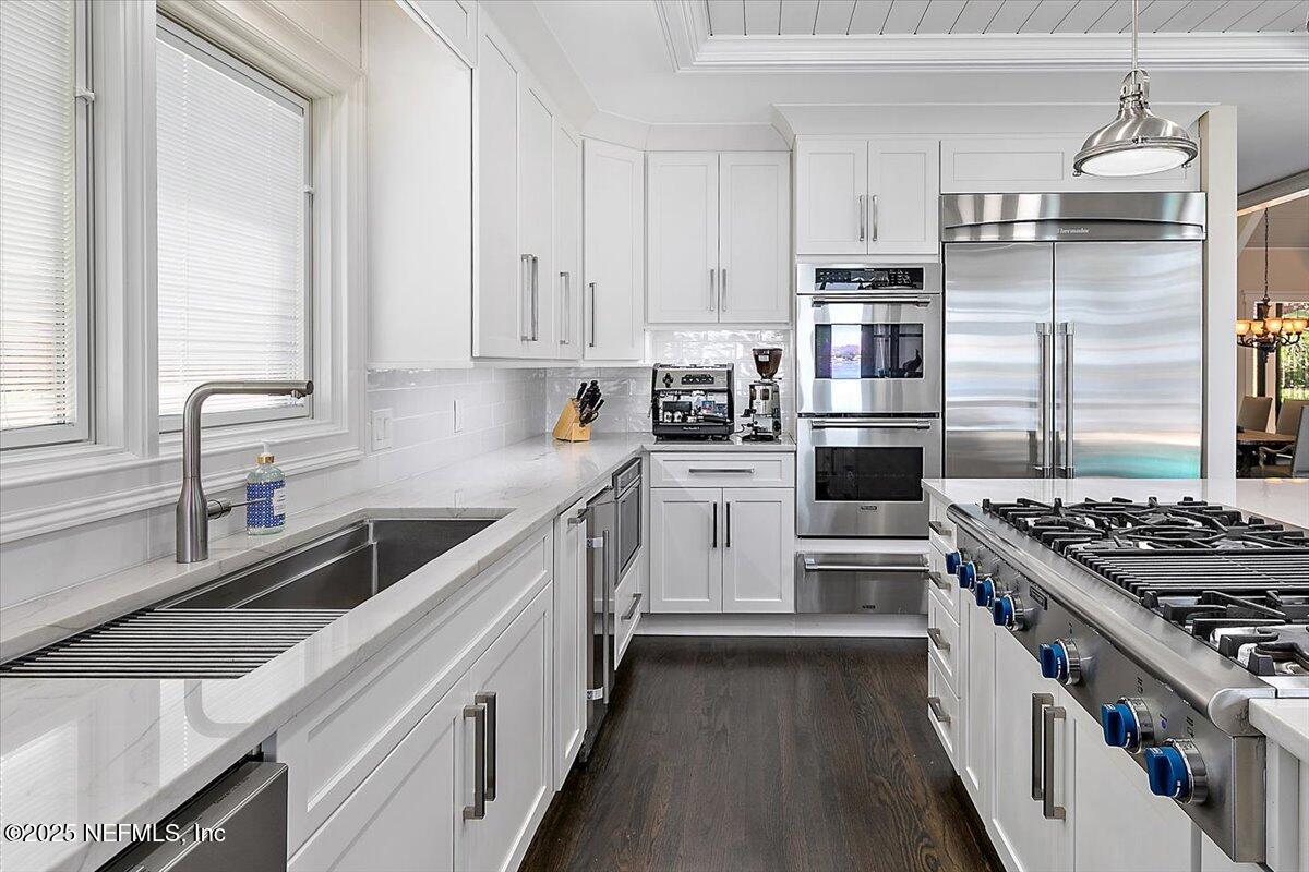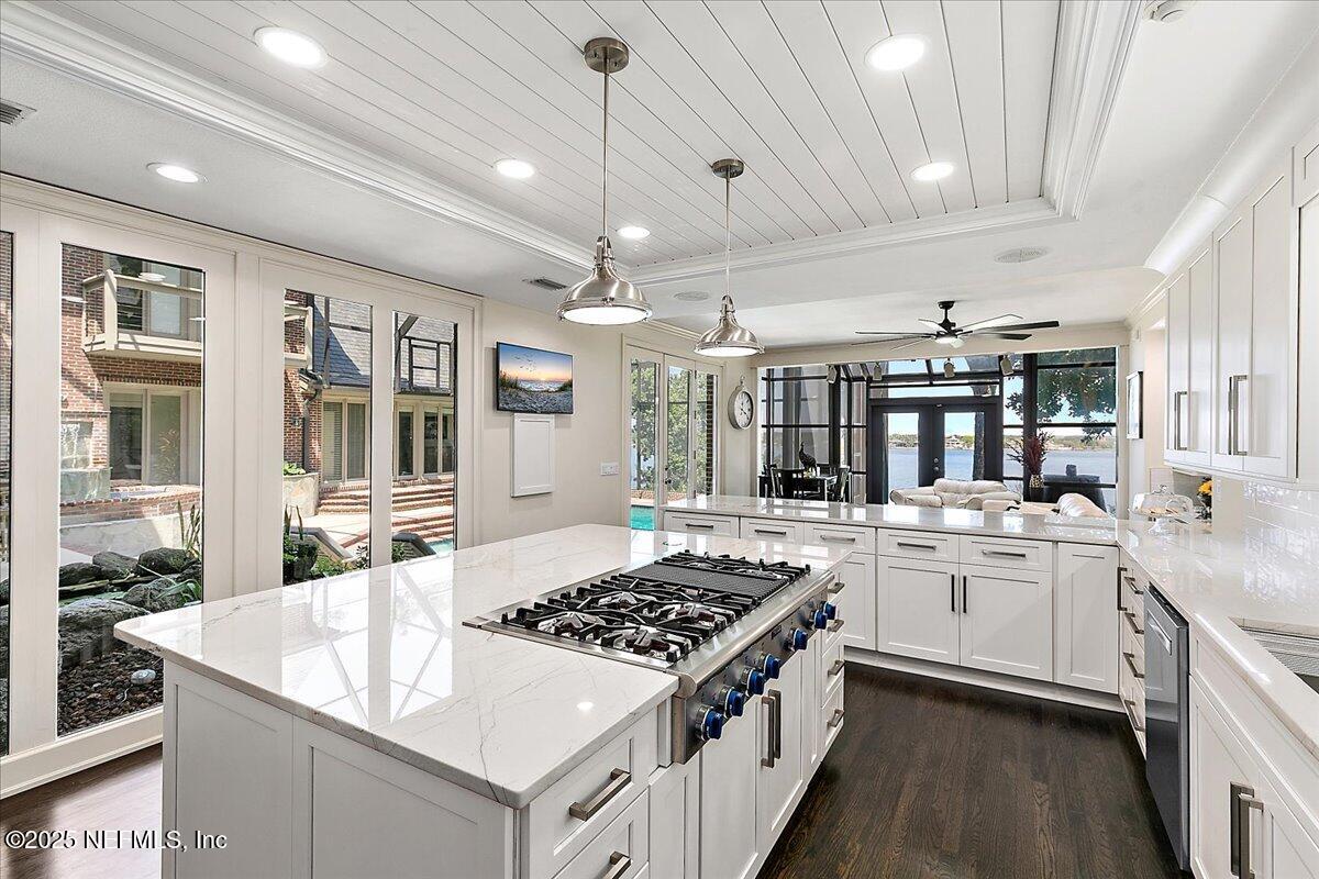 Custom elegant, gourmet kitchen with quartzite countertops, large island and Thermador appliances, including 6 burner gas stove