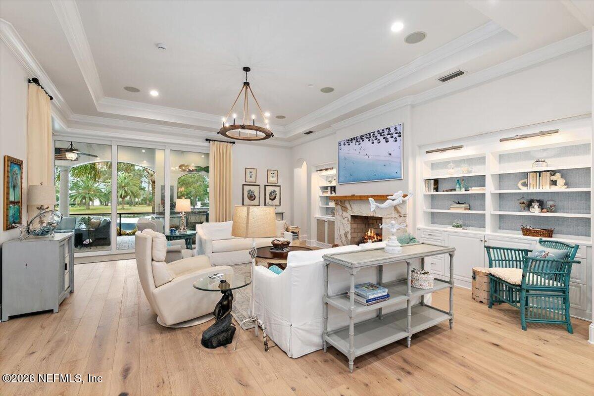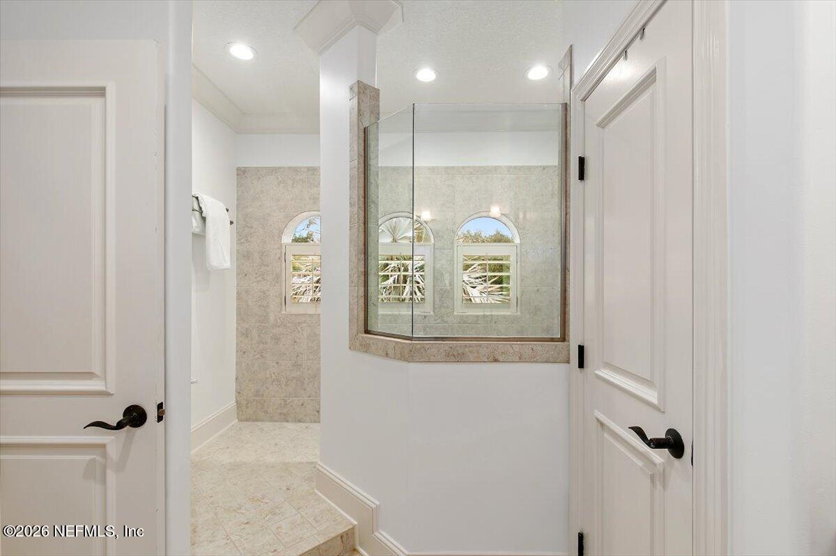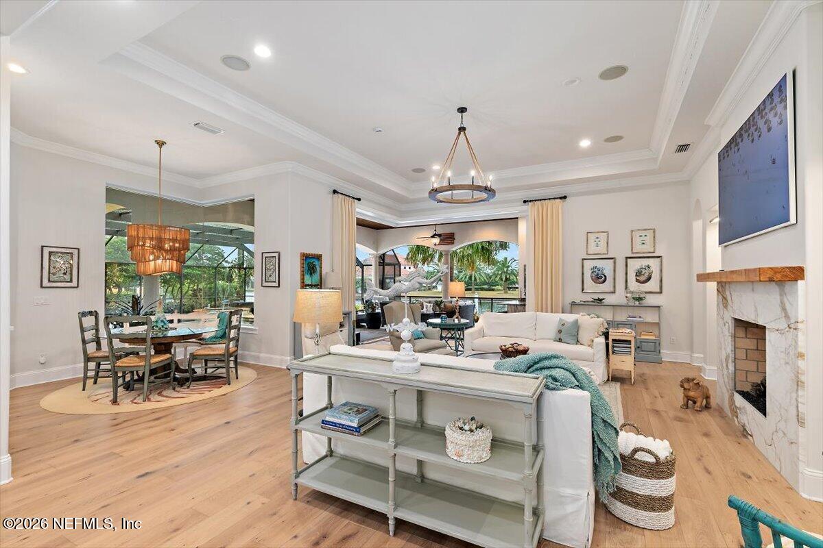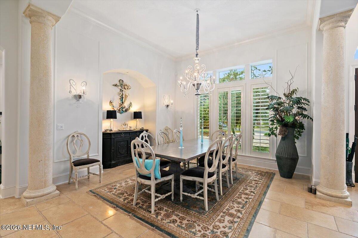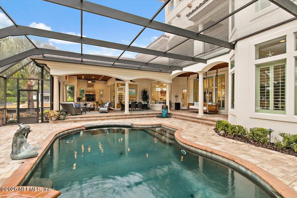 Abundant natural light, high ceilings and water views from almost every room. Travertine flooring in formal areas and stunning stair case, totally renovated kitchen with big island, white cabinets , quartz and Jennaire appliances. Updated butlers pantry /wet bar, & Family room with new fP and new wide plank flooring. New Sliders that open to huge up-dated screened pool, lanai and summer kitchen. Lux. 1st floor primary with 2 walkins, soaking tub, sep, shower, 2nd bedroom down with murphy bed. 2nd floor features a large 2nd family room with door to evening deck, a 2nd primary suite and 2 other ensuites bedroom. There is a possible elevator