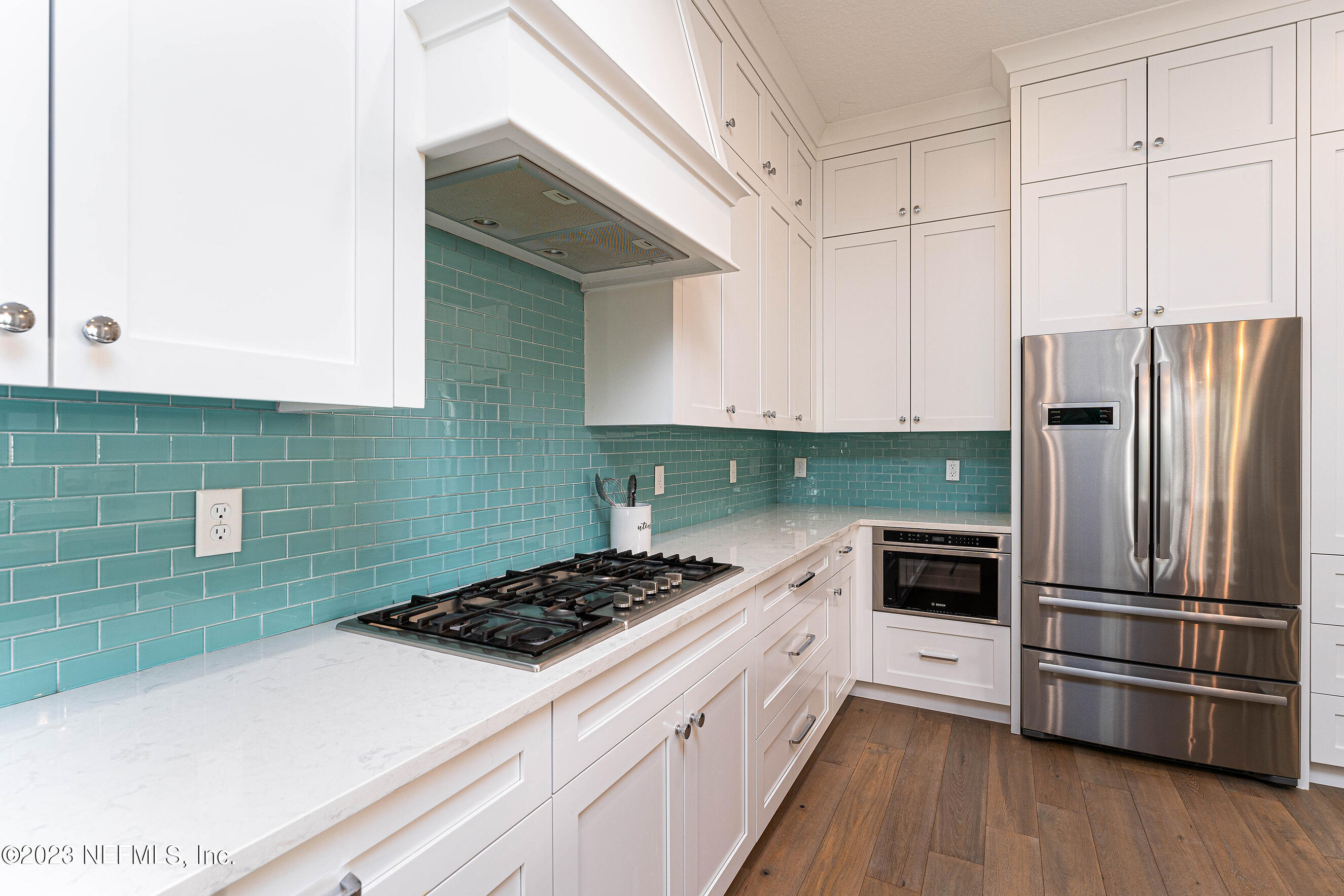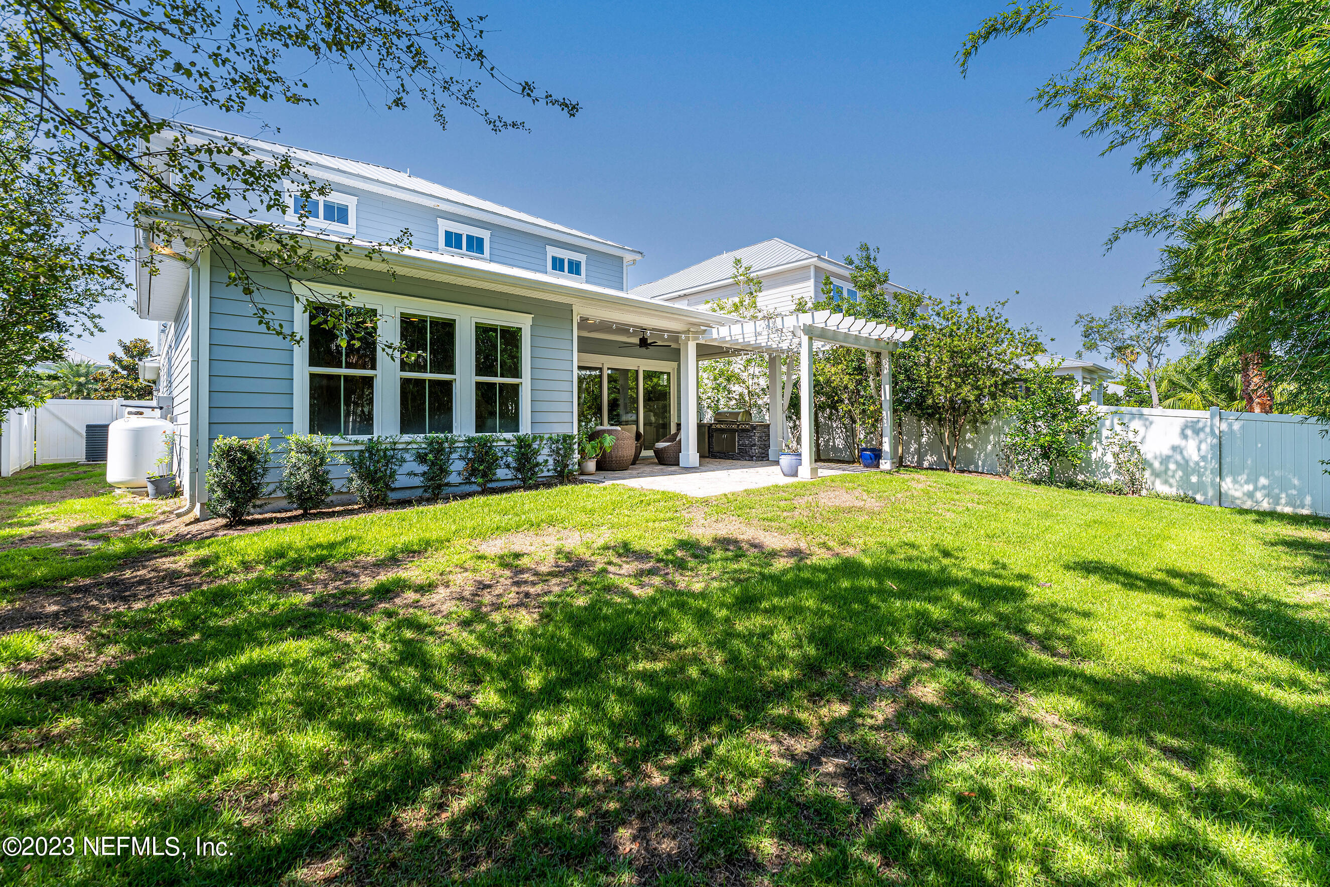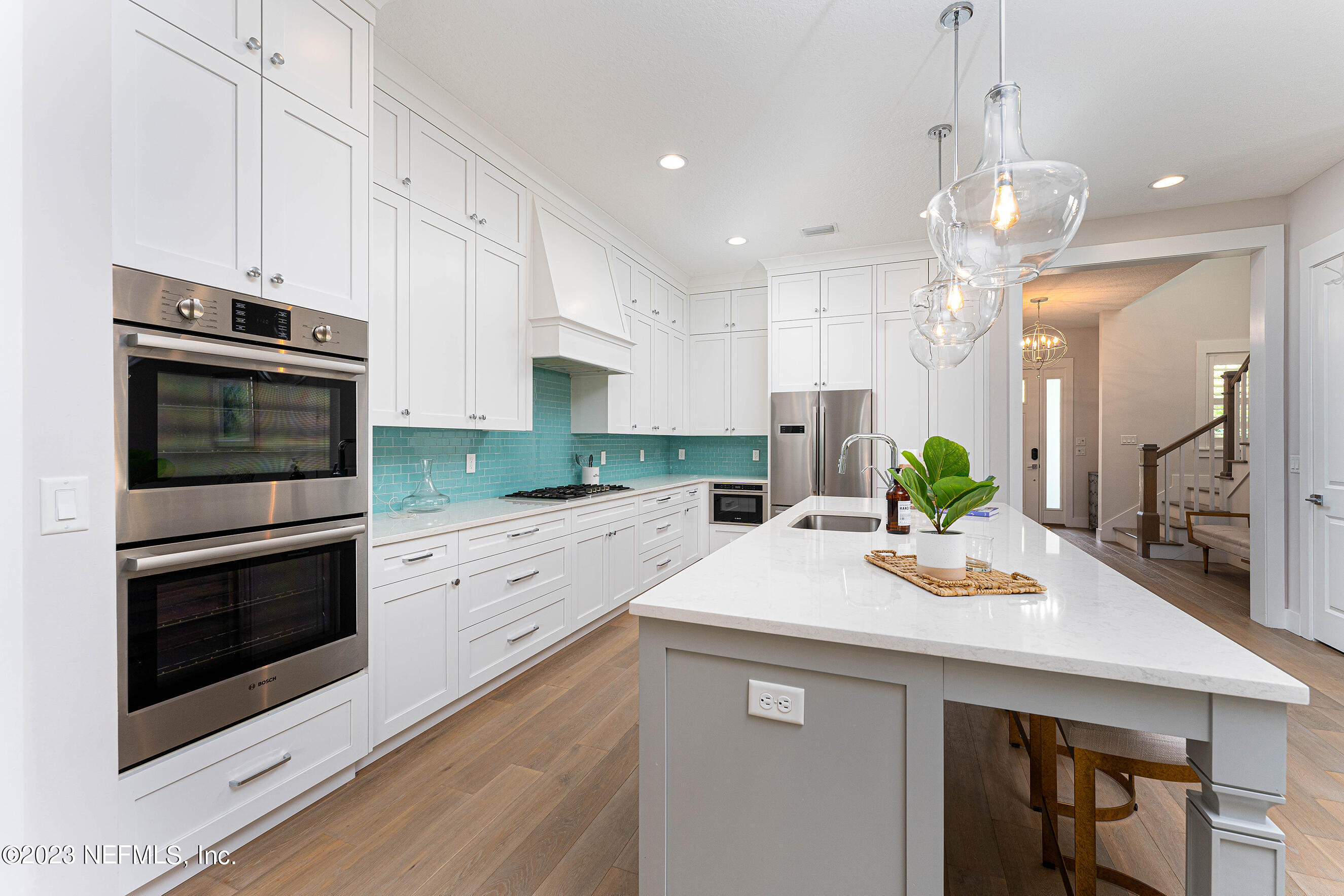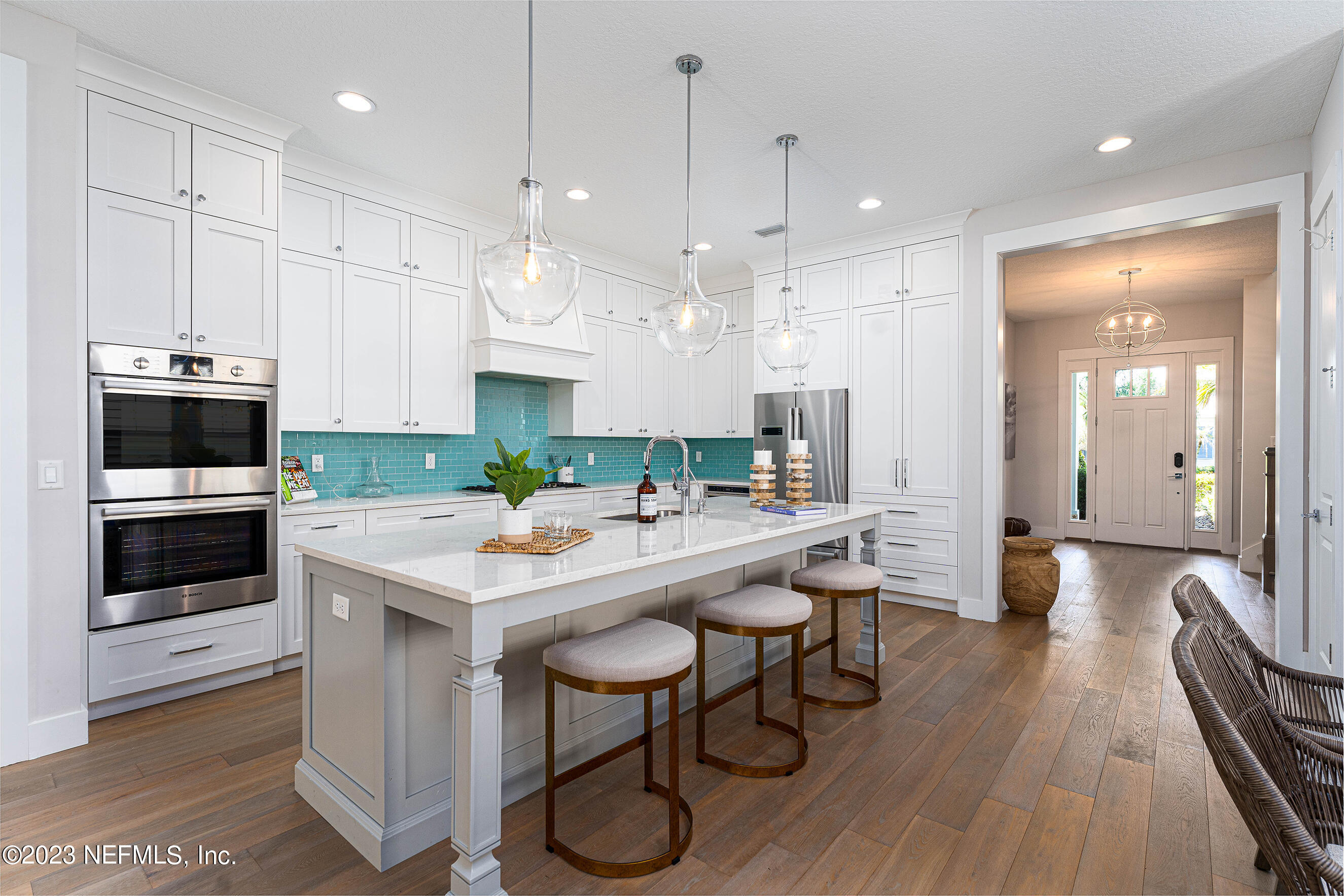 Located in St Johns County. No HOA Fees. This home is close to everything people love and appreciate about Ponte Vedra Beach, Jacksonville and Jacksonville Beach, this custom home presents a luxurious living environment with four bedrooms and four baths in approx. 3,233 s.f. Discover new wood flooring, new electric blinds, high ceilings, large windows, a main-level primary suite with two large closets, upstairs loft, covered patio and summer kitchen. The family room, complete with fireplace, surround sound and built-ins, flows to an island kitchen with soft-close ceiling-height white Shaker cabinetry, quartz countertops, full glass-tile backsplash, a pantry, wine refrigerator, and stainless Bosch appliances.