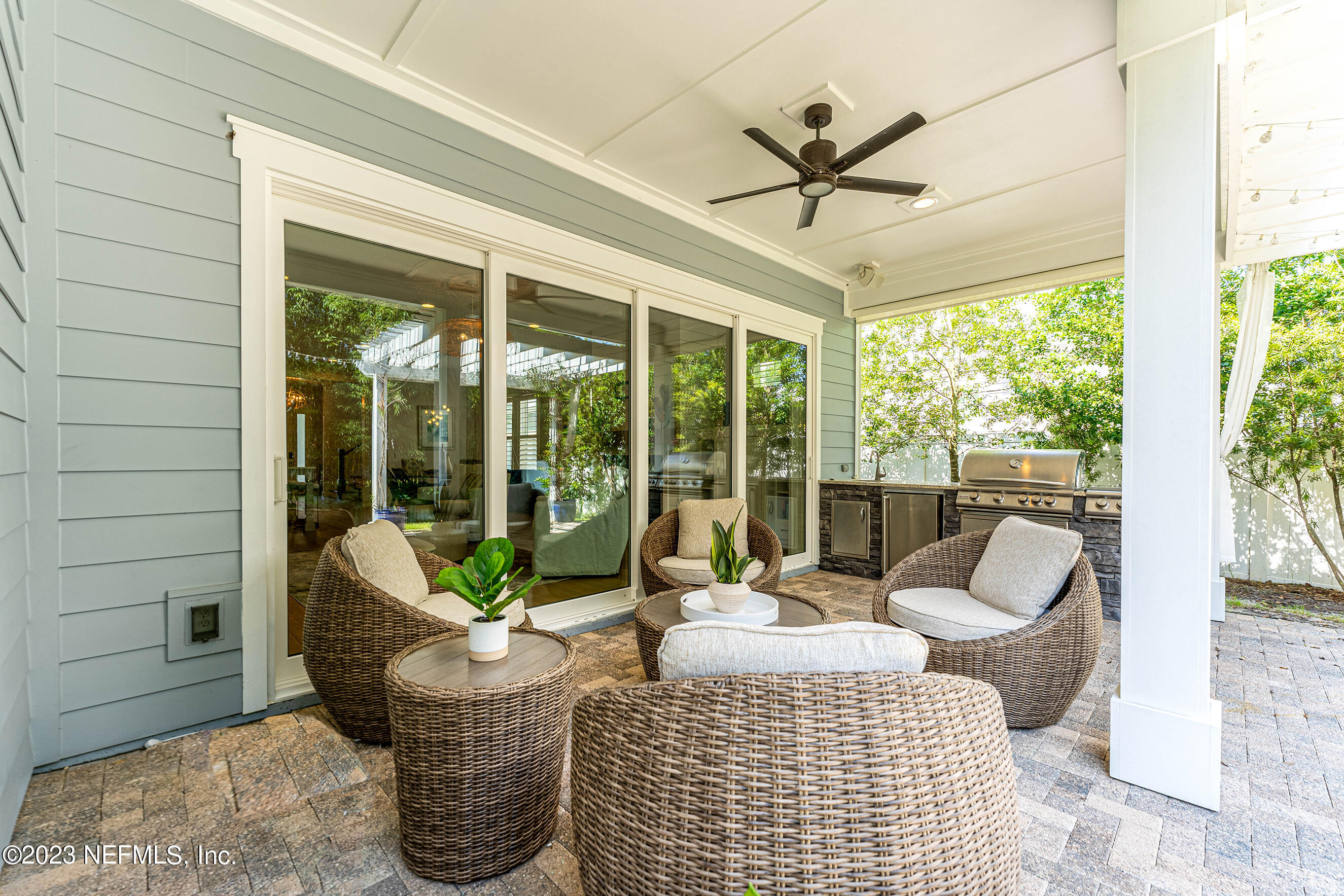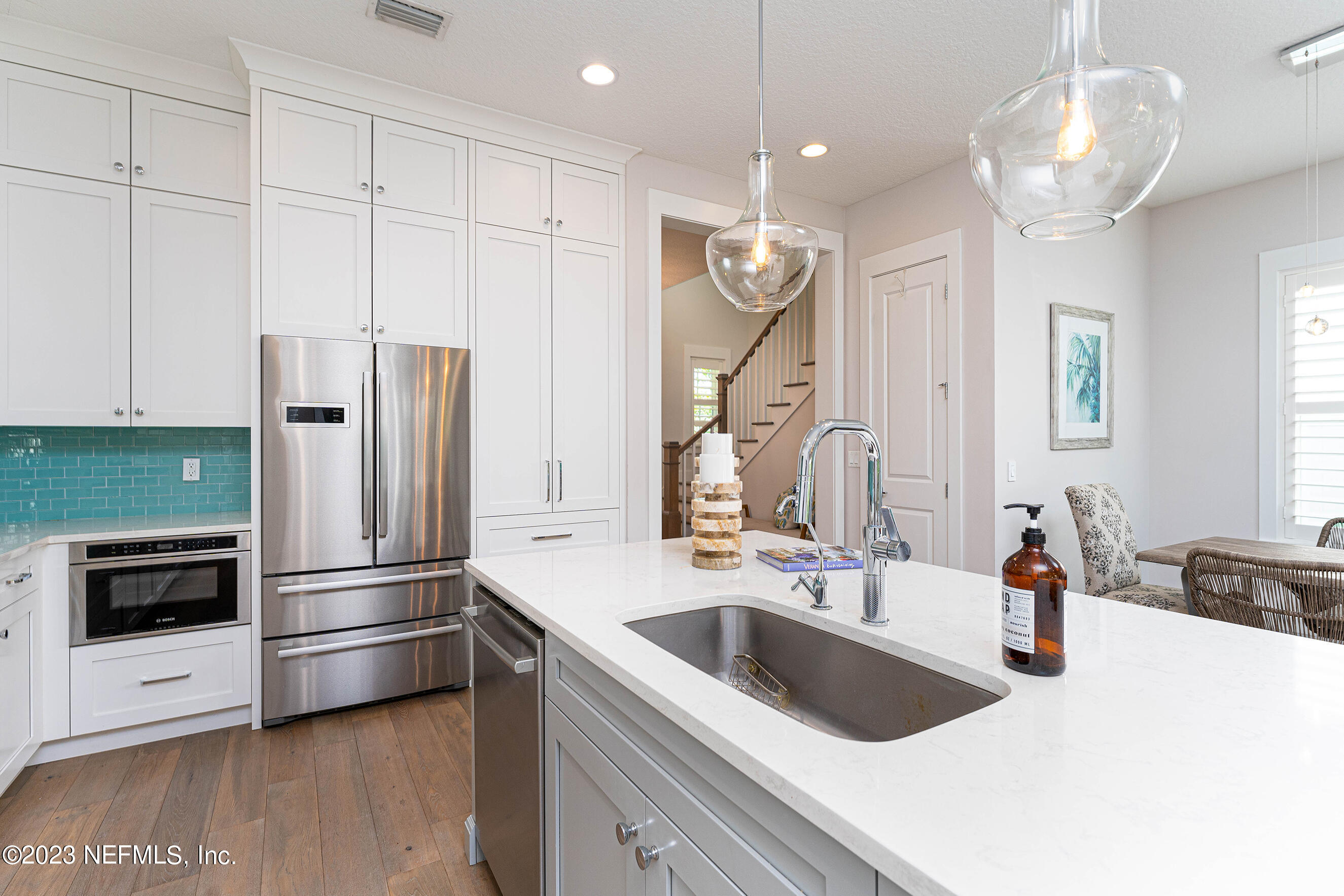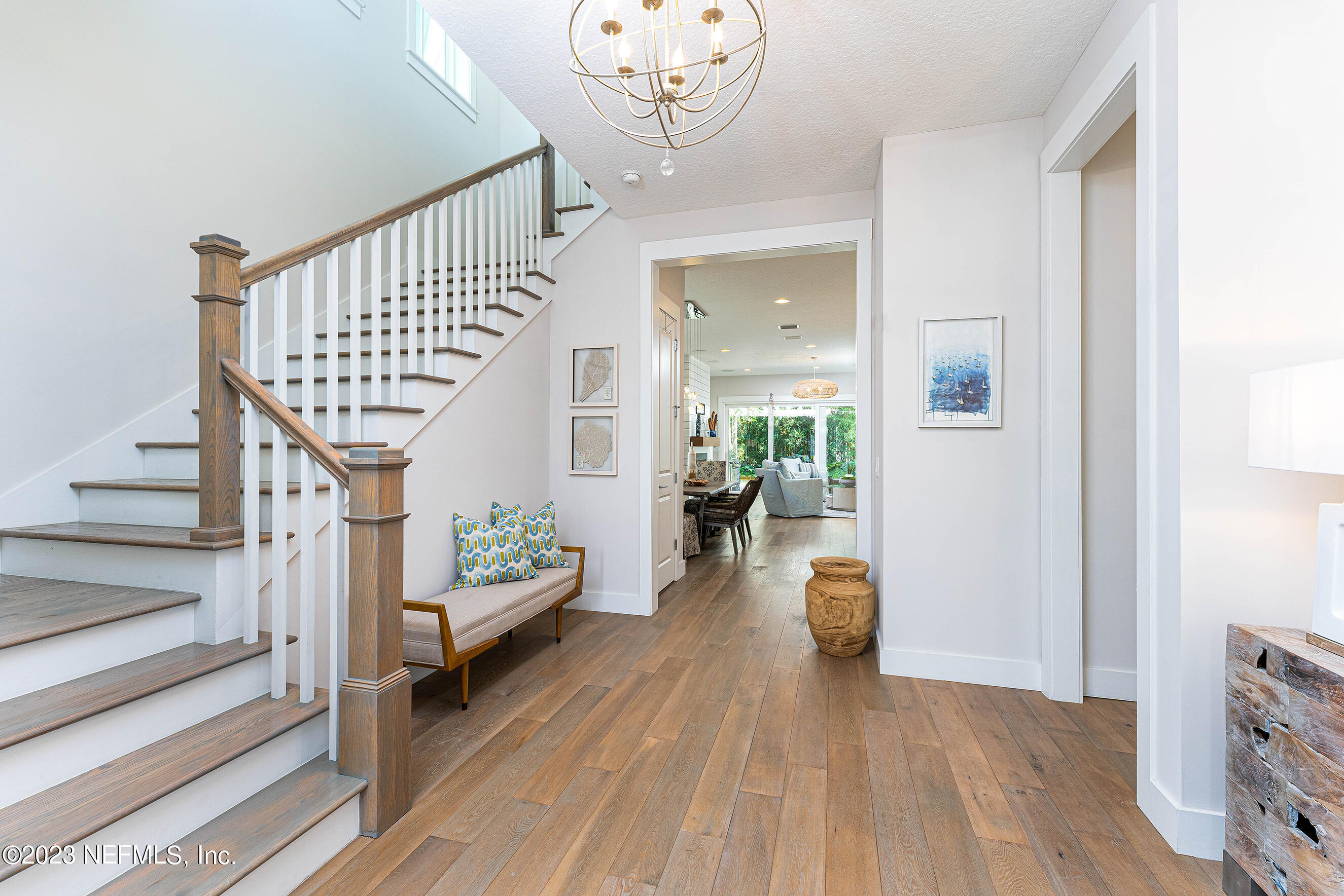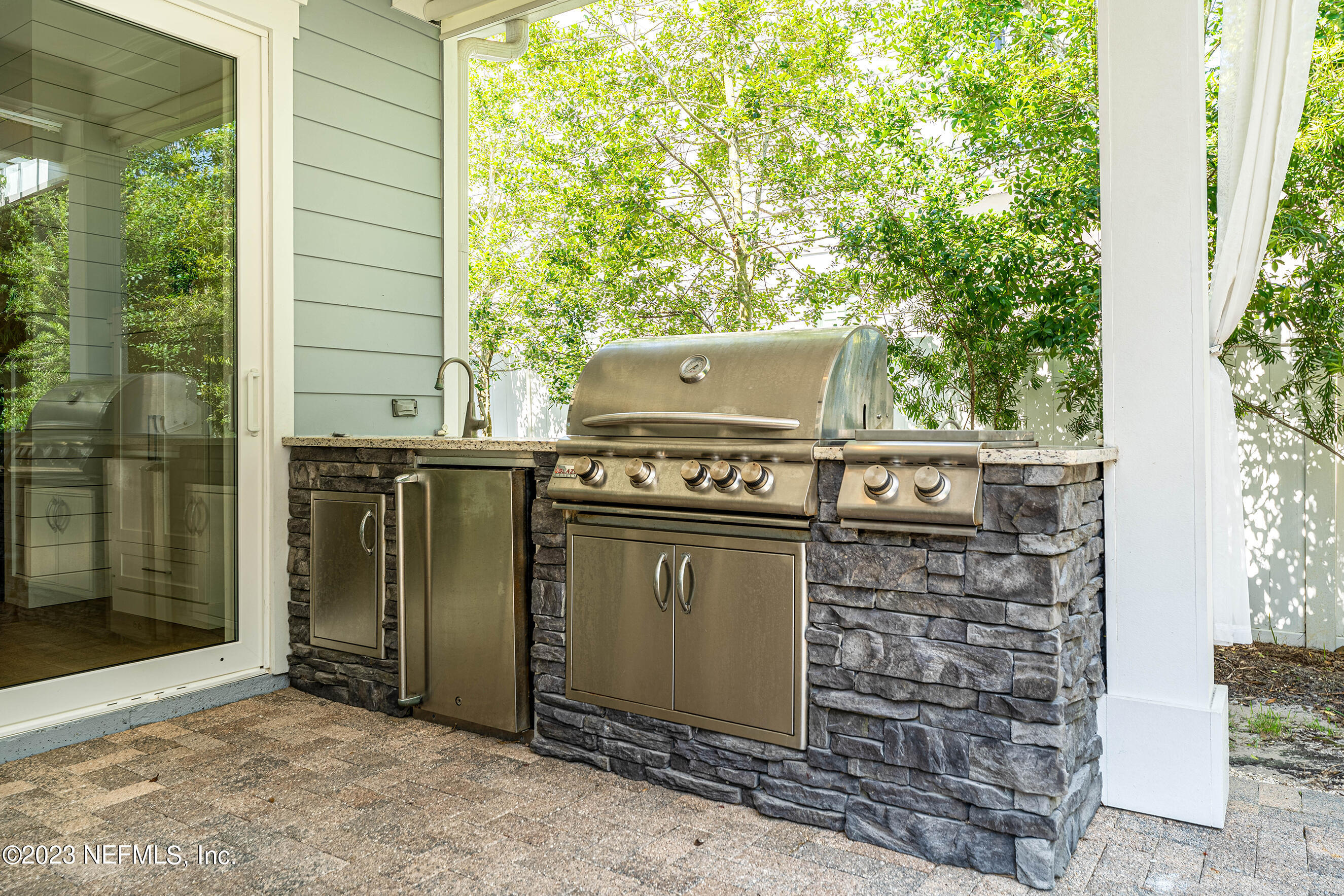 Located in St Johns County. No HOA Fees. This home is close to everything people love and appreciate about Ponte Vedra Beach, Jacksonville and Jacksonville Beach, this custom home presents a luxurious living environment with four bedrooms and four baths in approx. 3,233 s.f. Discover new wood flooring, new electric blinds, high ceilings, large windows, a main-level primary suite with two large closets, upstairs loft, covered patio and summer kitchen. The family room, complete with fireplace, surround sound and built-ins, flows to an island kitchen with soft-close ceiling-height white Shaker cabinetry, quartz countertops, full glass-tile backsplash, a pantry, wine refrigerator, and stainless Bosch appliances.