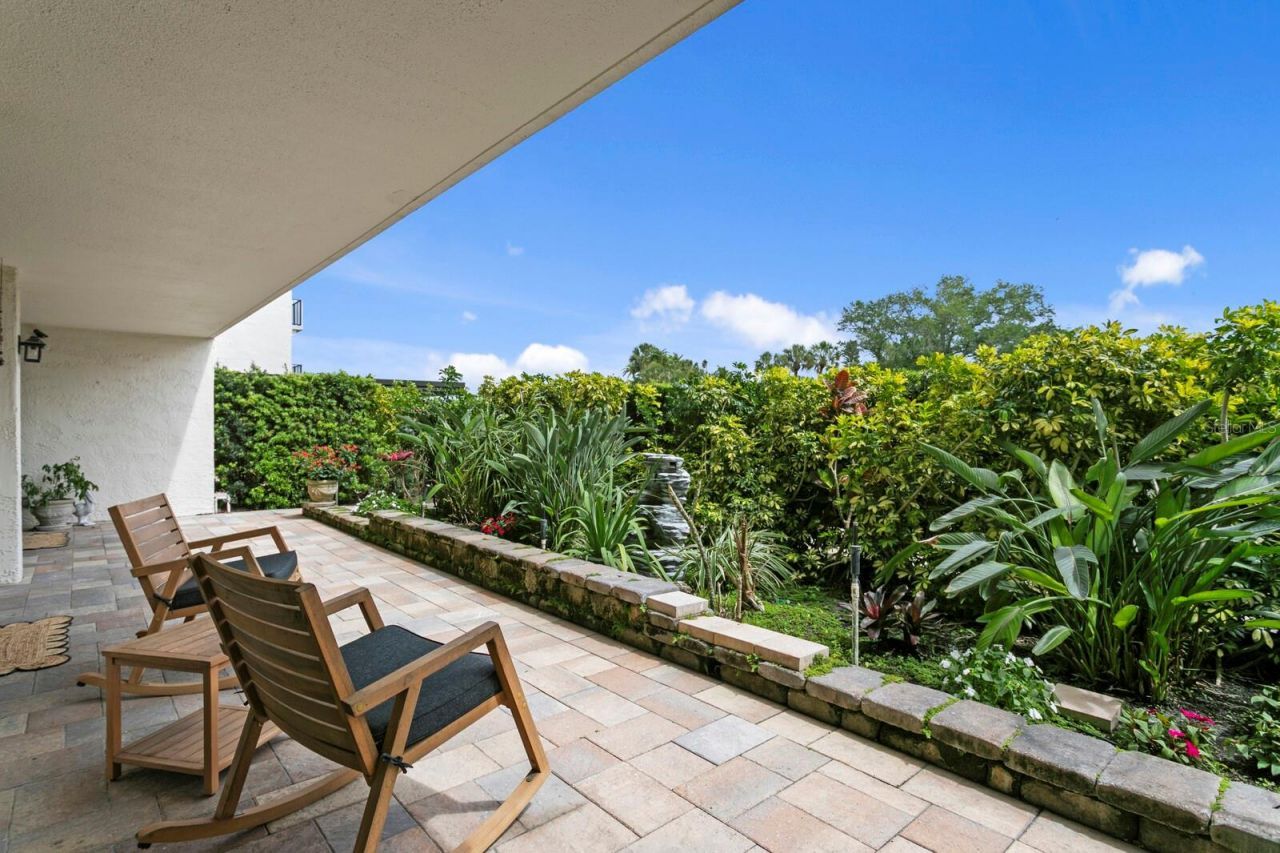 A ground-floor unit that lives like a private residence, with a true outdoor space that functions like your own backyard, directly alongside Belleair Country Club. In a community where most homes have upper-level living, this one is designed for ease. Walk-out access, no need for elevators and a direct connection to the outdoors from the living room and both bedrooms.The oversized paver patio sets this home apart, framed by a lush wraparound garden that creates both privacy and a true extension of the living space. Everyday moments become easier, from bringing in groceries to welcoming guests without navigating a lobby.Inside, the home has been updated and is ready for immediate use.Wood-look porcelain tile flooring runs throughout, creating durability and continuity with the indoor-outdoor lifestyle. The living room flows into a defined dining area and an updated kitchen with white shaker cabinetry, black granite countertops, stainless steel appliances, and peninsula seating beneath a tray ceiling. The primary suite opens directly to the patio and features plantation shutters, dual closets, and an updated ensuite bath. The secondary bedroom also offers patio access and sits adjacent to a full bath with a glass-enclosed shower.Additional highlights include newly installed hurricane-impact sliding glass doors, in-unit laundry, multiple storage closets, and a formal interior entry through double doors from a secured key-fob-access building. Community amenities include a pool, clubhouse, and proximity to the Intracoastal Waterway with views toward Clearwater Pass.Ownership within this community offers a rare connection to the Belleair Country Club, one of Florida's oldest private golf clubs, with shared grounds that create a true resort, golf cart lifestyle. If applying to join the club, owning here can provide potential advantages relative to the club's current waitlist, subject to BCC club approval and terms. Boat slips may be available for rent. Ideally located in Belleair with convenient access to Clearwater Beach, dining, and the greater Tampa Bay area, this property is well suited for full-time living, seasonal use, or low-maintenance coastal living within a historic golf community. New HVAC (2026) transferrable parts and labor warranty, roof (~2023).Please see the virtual tour link for a video walkthrough and a closer look at the breathtaking grounds.