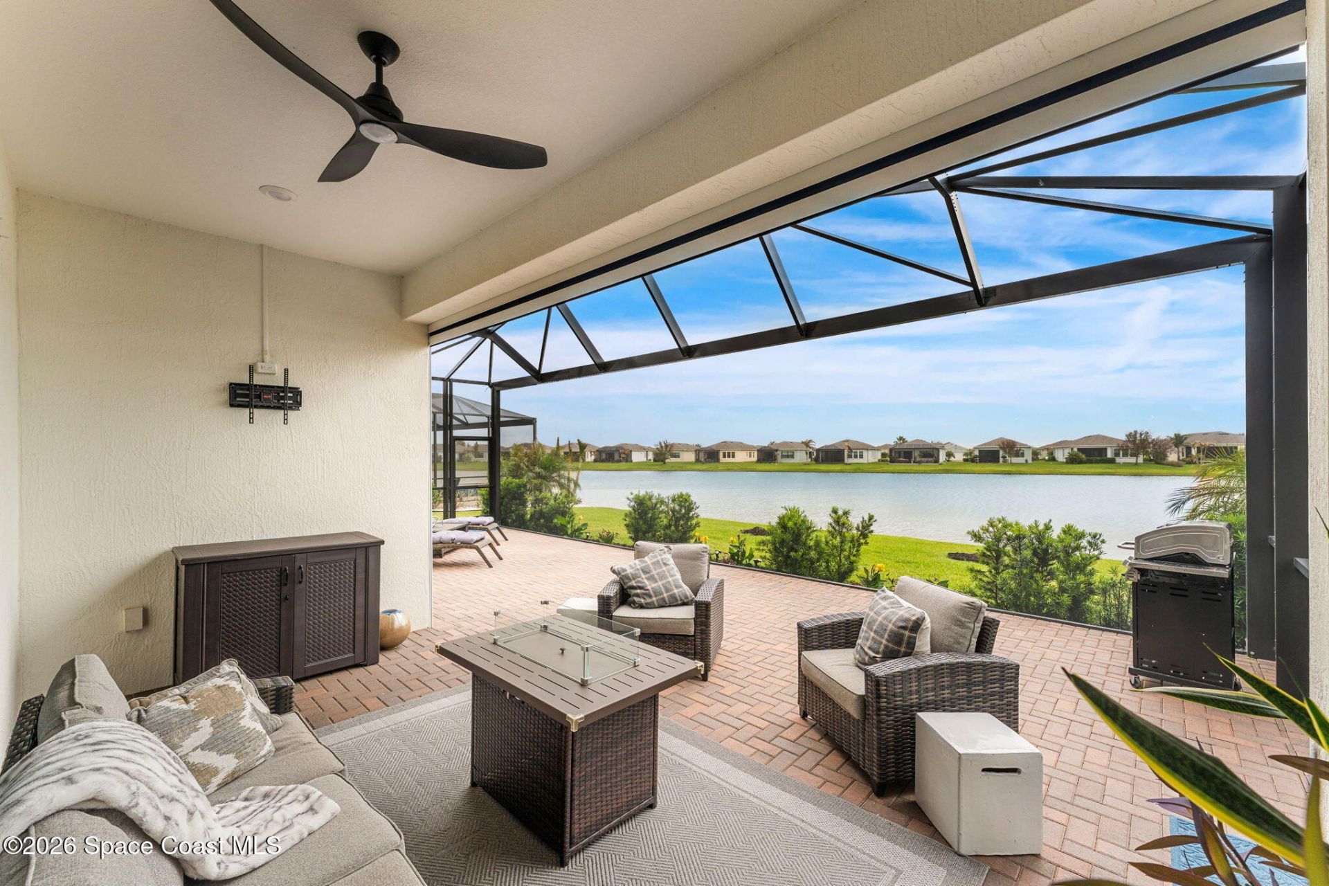 Expansive water views stretch wide across a panoramic, extended screened lanai, creating a striking backdrop for this meticulously maintained 2020-built residence in Bridgewater. The thoughtfully designed layout introduces a versatile den alongside three bedrooms, offering flexibility while maintaining an effortless flow throughout the home. Outdoor living is elevated with the enlarged lanai, complete with a remote-controlled screen that enhances comfort, shade, and privacy at any time of day. A long list of upgrades is evident at every turn, including a whole-home water treatment system and softener, along with all-new kitchen fixtures and faucet and updated faucets and bathroom fixtures throughout, complementing the homes clean condition and attention to detail. The arrival sets the tone with an extended paver driveway, manicured landscaping, and full accordion storm protection, all within a gated community known for its clubhouse, amenities, and low-maintenance lifestyle.