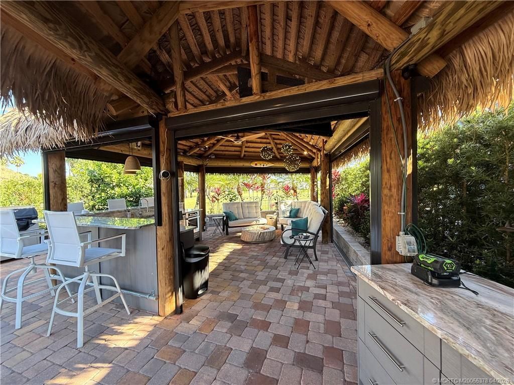 Perfectly positioned on an extra-wide, north-facing homesite, this exceptional lot captures sweeping views of the 8th and 9th holes, complemented by a serene lake with a lighted fountain and a picturesque bridge leading to the 8th hole-an idyllic setting to sit and read or just relax. Thoughtfully landscaped with raised beds and expansive paver patios, the property offers both privacy and polished curb appeal. The impressive L-shaped tiki is designed for elevated outdoor living, featuring upgraded marine-grade cabinetry with a granite countertop, plush, high-end furnishings, and remote-controlled screens that provide effortless comfort and privacy in any setting. Ideally located just moments from the main clubhouse, resort-style pool, sports facilities, and bark park, this lot combines luxury, convenience, and lifestyle-an outstanding opportunity to enjoy the very best of resort living.
