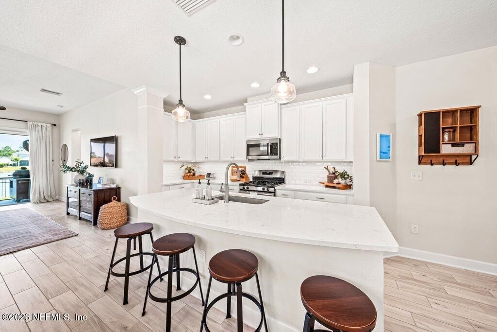 Enjoy easy Florida living in this bright, beautifully designed single-story home. A light-filled interior welcomes you in, along with a flexible front space perfect for a home office, playroom, or additional living area.Hardwood-look tile runs throughout the main living spaces, with cozy carpet in the bedrooms. Two secondary bedrooms and a full bath are located at the front of the home, while the private primary suite is tucked in the back.The crisp white kitchen opens seamlessly to the living and dining areas, creating an ideal space for everyday living and entertaining.Relax on the screened lanai overlooking peaceful water views--the perfect spot for morning coffee or evening unwinding.Located in the desirable Crosswater community of Nocatee, close to top-rated schools, amenities, shopping, and dining. Just a 20 minute drive to the beach! Dont miss this one!