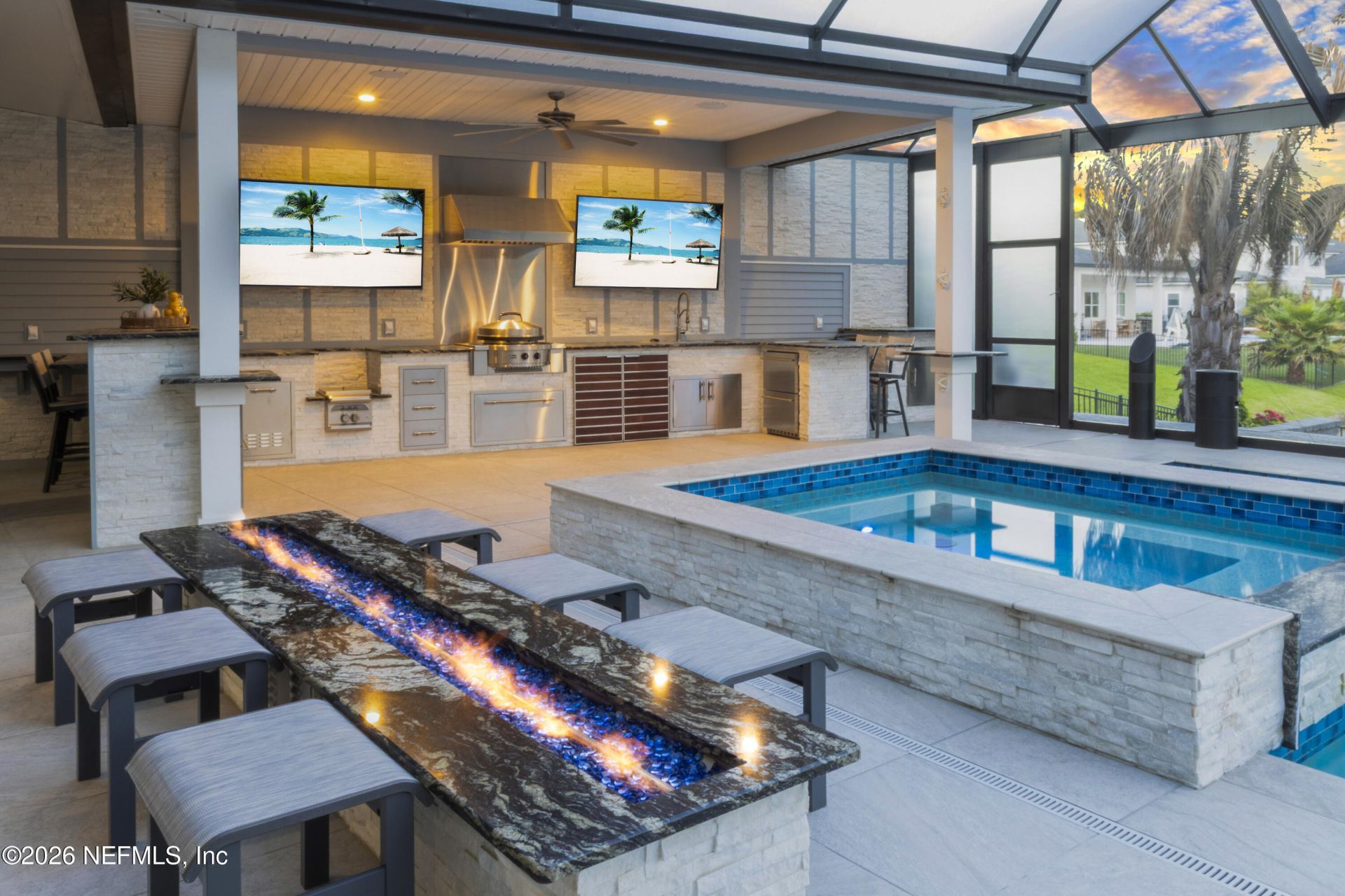 This Toll Brothers home in Coastal Oaks has the WOW factor! Nearly 4,800 square feet of living space with extensive custom upgrades inside and out. The Westbrook floor plan offers 5 bedrooms, 4 bathrooms and a 3-car garage with the primary suite and an additional bedroom downstairs.Inside, the craftsmanship is immediately evident. High end wood & tile flooring, custom tongue-and-groove tray ceilings, designer paint finishes, and architectural ceiling details with integrated lighting and speakers create visual interest in every room. Wall treatments like custom wainscoting, picture-frame molding, shiplap accents, and designer paneling--delivering a refined coastal aesthetic throughout. There are no builder-grade finishes here--only a fully upgraded custom woodwork package with curated millwork!A stunning, custom-crafted fireplace surround with built-in cabinetry serves as a focal point in the main living space, professionally designed and hand-built on site with bespoke detailing and integrated shelving. The gourmet kitchen is a true showpiece, featuring top-tier Wolf appliances, a Sub-Zero refrigerator, gas range, pot filler, and an expanded layout thanks to a 6-foot builder bump-out that enhances both the kitchen, sunroom and dinette areas. Custom cabinetry extends to the ceiling, while a fully upgraded walk-in pantry offers built-in organization designed for both everyday living and entertaining.The main living areas flow effortlessly into an enhanced indoor-outdoor experience, where a resort-style backyard awaits. The screened pool enclosure features oversized 24 x 24 porcelain pavers for a sleek, low-maintenance finish. A custom-designed pool showcases striking fire bowls, cascading water features, and programmable color-changing lighting, creating a dramatic evening ambiance. The outdoor kitchen is IMPRESSIVE, complete with premium built-in appliances, expansive prep space, and dual mounted televisions--ideal for year-round entertaining.Upstairs are three spacious bedrooms and an expansive 280-square-foot outdoor living area on the balcony that extends the home's entertaining potential. Pre-wired for television and pre-plumbed for a future bar, sink, or bathroom, this flexible space offers endless customization possibilities.Beyond the pool, the expansive backyard overlooks tranquil water views and is further enhanced by a rare, custom-designed sandy beach area--offering a truly unique, resort-style setting. Professionally installed FX Luminaire landscape lighting, featuring 90 lights and a transferable warranty, illuminates both the front and rear of the property, while additional fire and lighting features elevate the outdoor atmosphere.Premium paver hardscaping begins at the driveway and continues in a seamless 360-degree pathway around the home, providing elegant, mud-free access to all entry points. Custom Tremron planters and thoughtfully curated landscaping further enhance curb appeal. Discreet, custom-built exterior enclosures on both sides of the home conceal storage for trash receptacles and pool equipment, maintaining a clean and polished exterior.Additional interior upgrades include: -Plantation shutters throughout, custom closet systems with built-in organization,-an upgraded laundry room featuring custom cabinetry, an apron-front sink, and designer finishes,-a designer lighting control system with custom laser-engraved switches provides intuitive, room-by-room functionality with a clean, cohesive aesthetic,-a state-of
