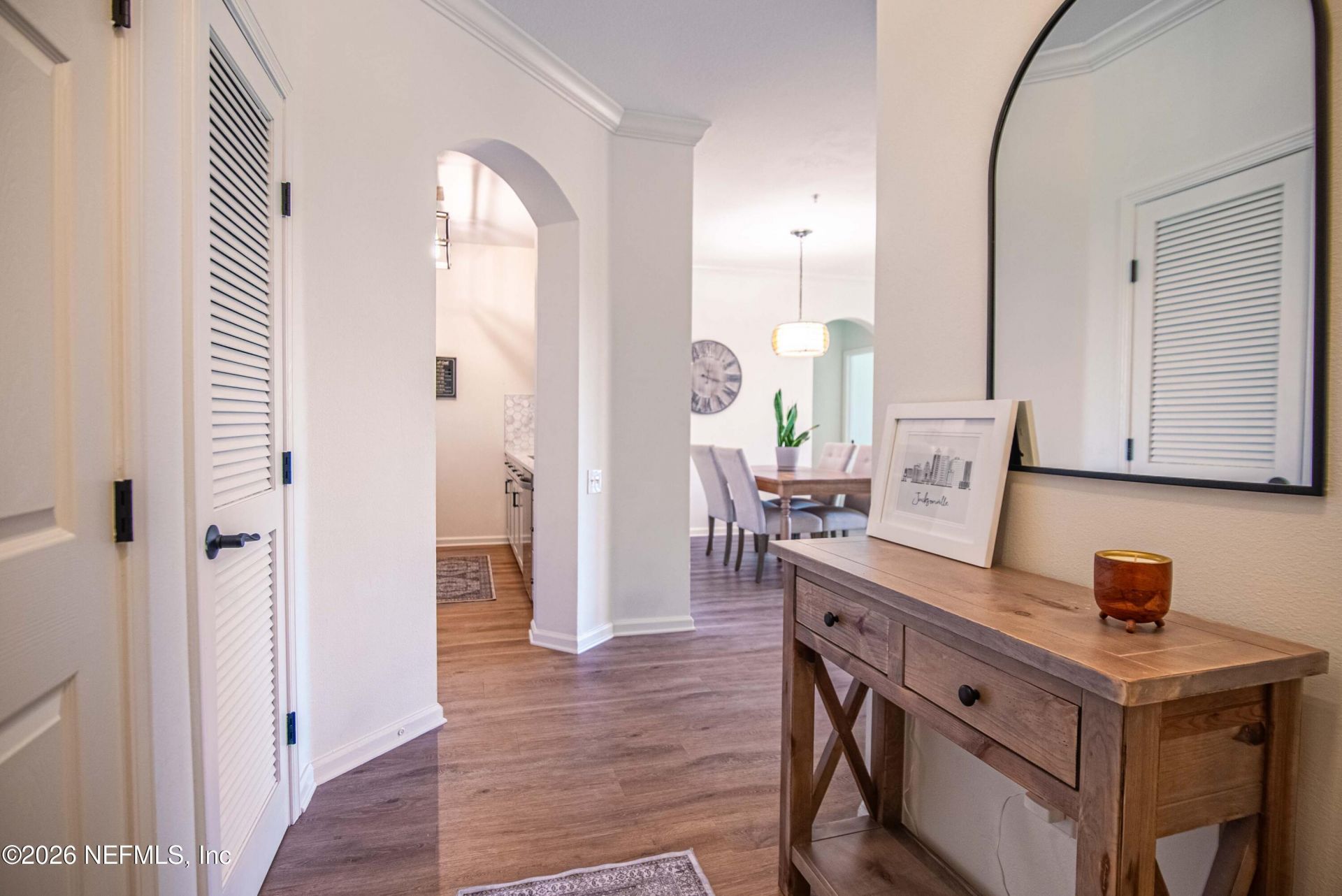 No expense was spared in creating total luxury and style in this 3 BR/2 full bath home, with newly replaced windows ($7K), HVAC ($7K), luxury vinyl plank (scratch resistant) flooring, bathroom renovations and complete kitchen renovation including custom cabinetry, quartz countertops, backsplash, hardware, RO water system, lighting and appliances. 9 foot ceilings and crown moldings add to the bright, relaxing living space. Enjoy the split bedroom design off the open-concept living space for aesthetic and functional flexibility. Within the primary suite haven, the seller has generously added a cabinet with quartz countertop in the master walk-in closet located next to the private primary bath. This unit was chosen by the seller because it offered the tranquillity from facing the lake and the privacy and convenience of being on the second floor along with being close to the high-end shopping at St Johns Town Center. The private screened-in balcony overlooking the lake with the sound of the fountain will remind you to exhale and relax each day. Your location in this home offers you most convenient access within the Jacksonville area, just named the Number One city for First Time Homebuyers! Close to health facilities, dining, shopping, commuting routes/ route 295, airport, and endless recreation... including Top Golf just minutes away. HOA fees include water, trash, maintenance and use of amenities such as pool, clubhouse, fitness center, car wash area and walking paths.