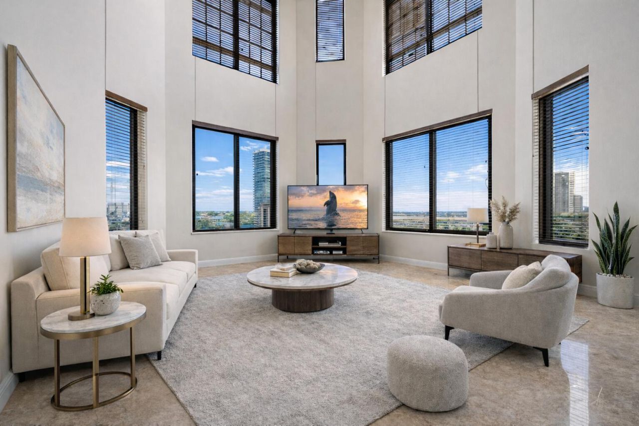 One of a kind spacious 2 story condo with 25 foot ceilings, Entire unit completely freshly painted, All new stainless steel LG appliances July '23, new water heater '23, march '23 new a/c, all marble floors and bathroom shower and countertops just re-polished, 2 inch blinds throughout unit. Amazing architectural design, balcony off dining room w/SE city and partial intracoastal views. Located in the luxurious One City Plaza in downtown WPB! Open Floor plan, complimentary valet parking for guests. 2 parking spaces in covered parking garage w/no elevator access needed. Close to City Place, dining, PBI Airport and more! This luxury building has a 17th fl roof top inground pool with views of the intracoastal and Palm Beach Island, on site manager, fitness center, sauna, steam room, 7th floo R courtyard w/waterfall, trash chute, renovated community room, bike storage and a stunning lobby! Parking for electric cars also available. Located along Florida's Atlantic Ocean coast, West Palm Beach offers visitors year-round excitement within easy reach of smooth-sand beaches and some of the nation's most enticing waterways. Downtown West Palm Beach is home to four retail and entertainment districts Clematis Street, The Square, Northwood Village and Antique Row. These vibrant pieces of West Palm Beach are lined with fashionable bars, nightclubs, boutiques and collectables. The handicap-accessible Downtown Trolley makes getting around the Clematis and Rosemary Square Districts a breeze. It is a convenient way to visit all your favorite Downtown shops, restaurants, and attractions. The Trolley picks up passengers every 10-15 minutes at designated trolley stops located throughout the Downtown. ** Pics show original photos and potential renovation renderings. **